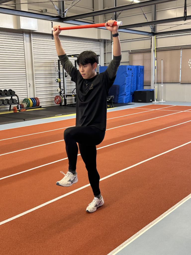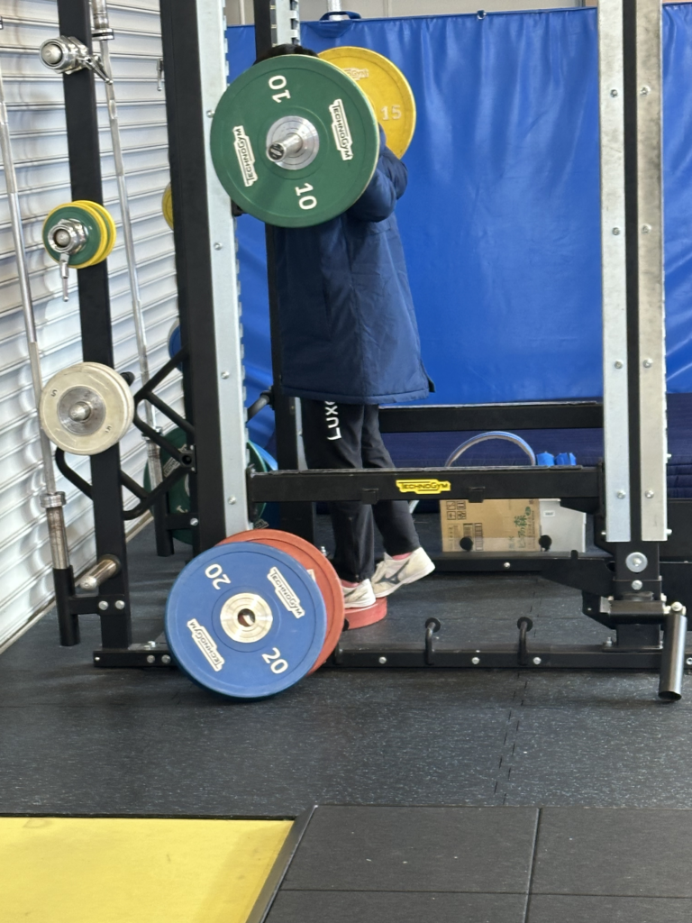 スクワット、クリーン、デッドリフト、カーフレイズを行い、力を素早く発揮する感覚を身体に覚えさせています。